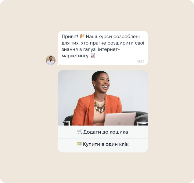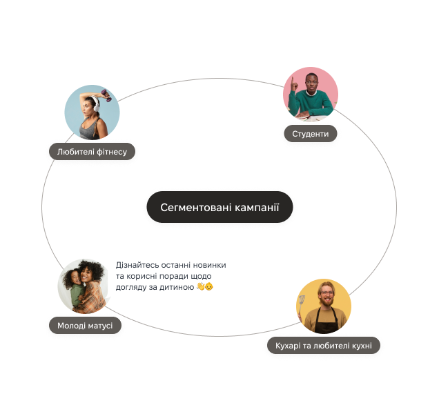 Таргетуйте окремі групи аудиторії за допомогою месенджерів. Розділяйте клієнтів за інтересами та потребами, щоб автоматично або вручну повідомляти їм про акції, новинки чи сезонні розпродажі в онлайн- чи офлайн-магазинах.